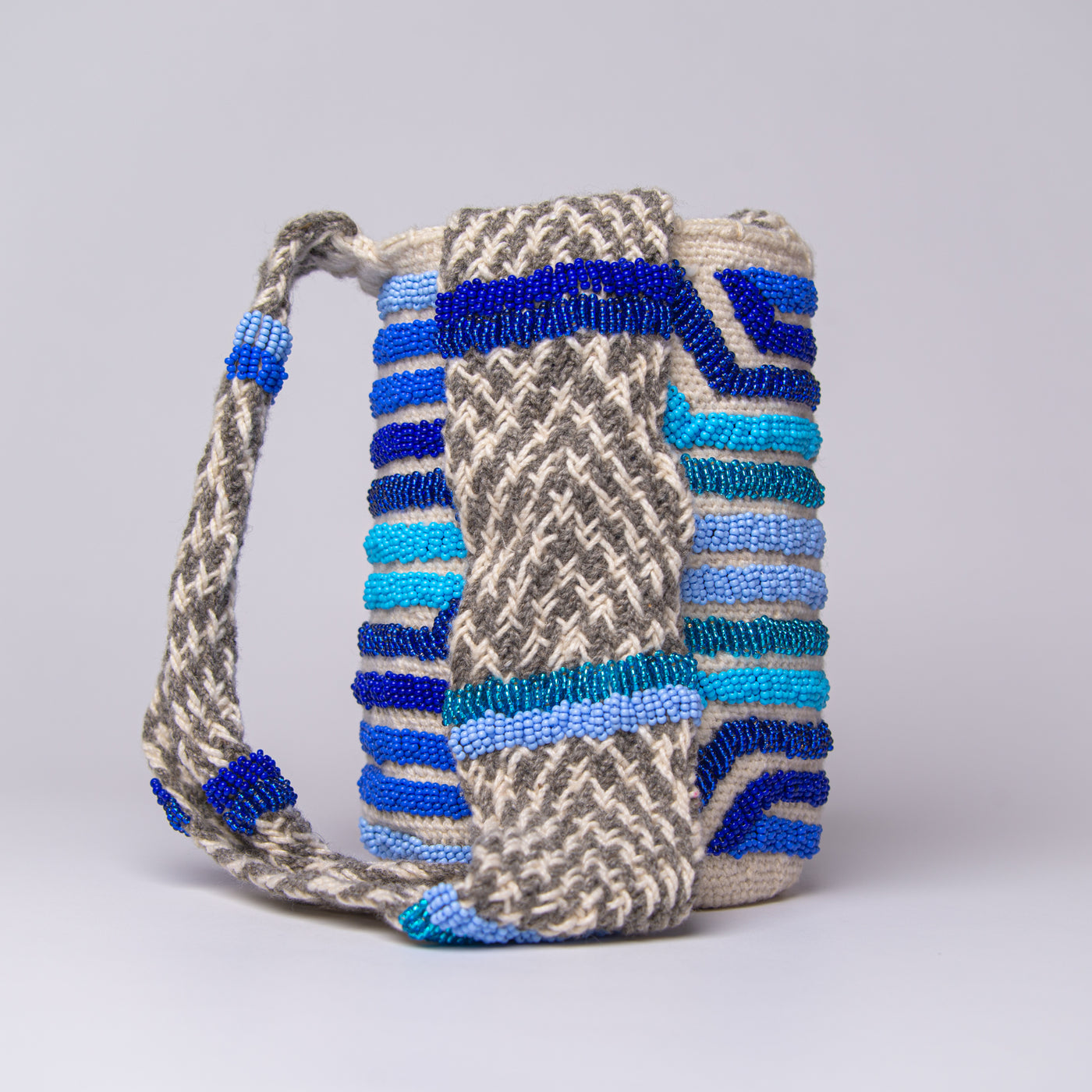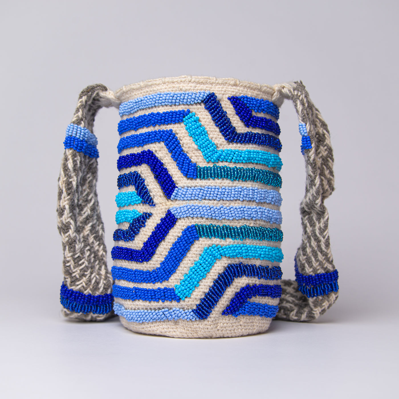 Inspired by the Caribbean Sea and Colombia's deep skies, the Paraguana Bucket Bag features rolling waves made in five shades of blue Chaquira beads on a base of cream-colored yarn.